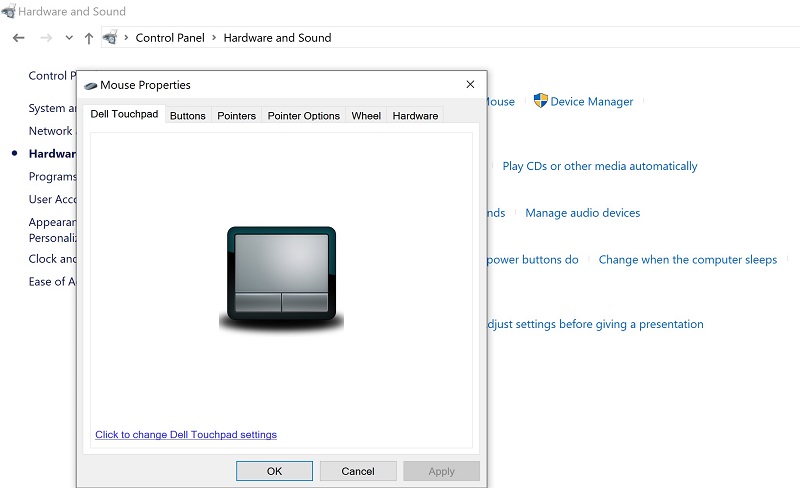 Tùy theo hãng laptop, tab Device Settings có thể có tên khác như ELAN, Synaptics, Dell Touchpad...